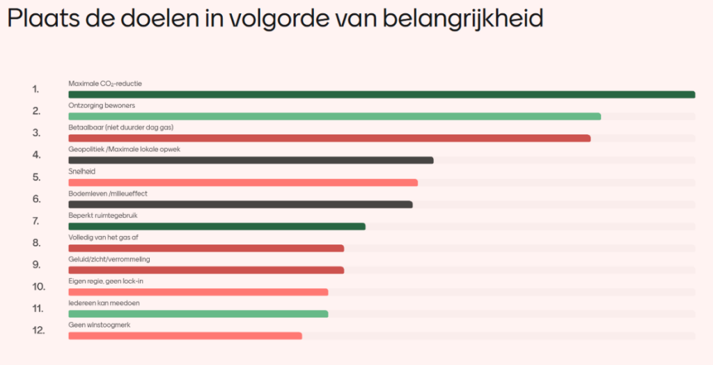 • Milieu vs. Portemonnee: Er is brede consensus dat CO2-reductie een mooie ‘bijvangst’ is, maar de meeste buurtbewoners niet zal overhalen om overstag te gaan.